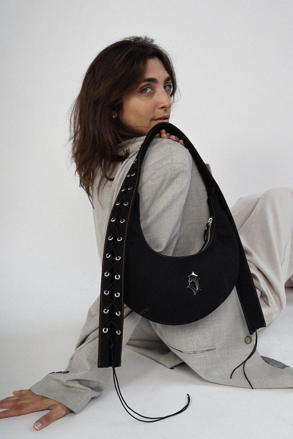 TODOS LOS ELEMENTOS METALICOS SON DE COLOR PLATEADO - LA CHAPA DE MARCA ES UNA "S" GOTICA METALICA COLOR PLATA ADHERIDA EN LA PARTE CENTRAL DEL BOLSO .